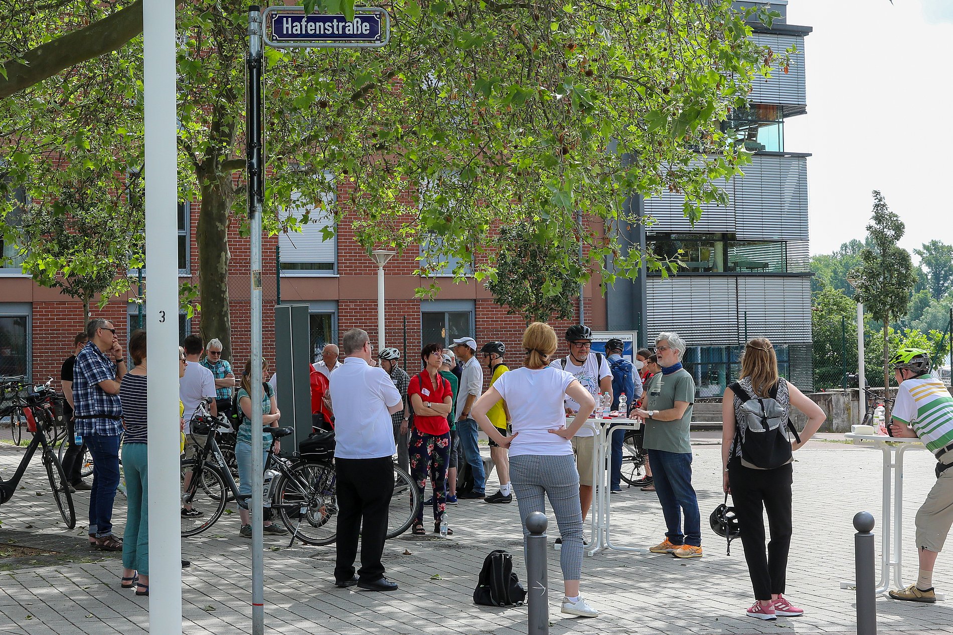 Mit dem Fahrrad ging dann für die Teilnehmenden der Rundfahrt weiter zum Stadtteil Gräselberg, der mit seinen 6.000 Einwohnern einer der vier Wiesbadener Standorte des Bund-Länder-Programms Sozialer Zusammenhalt ist. Durch das Programm werden benachteiligte Stadtteile mit städtebaulichen Investitionsmitteln gefördert und Bewohnerinnen und Bewohner durch Soziale Arbeit wie ein Quartiersmanagement und Gemeinwesenarbeit unterstützt. Insbesondere durch Partizipation werden Menschen in ihren Anliegen und Bedürfnissen ernst genommen und an Gestaltungsprozessen aktiv beteiligt. Auf dem Gräselberg konnten die Teilnehmenden im Rahmen eines Rundgangs den Stadtteil zunächst selbst entdecken. Um die Eindrücke festzuhalten machten alle Fotos, eine sogenannte Autofotografie. Der Austausch zu den eignen Eindrücken war der Auftakt zu einem intensiven Gespräch mit der Quartiersmanagerin Angelika Wust, die ihre Arbeit im Stadtteil vorstellte.