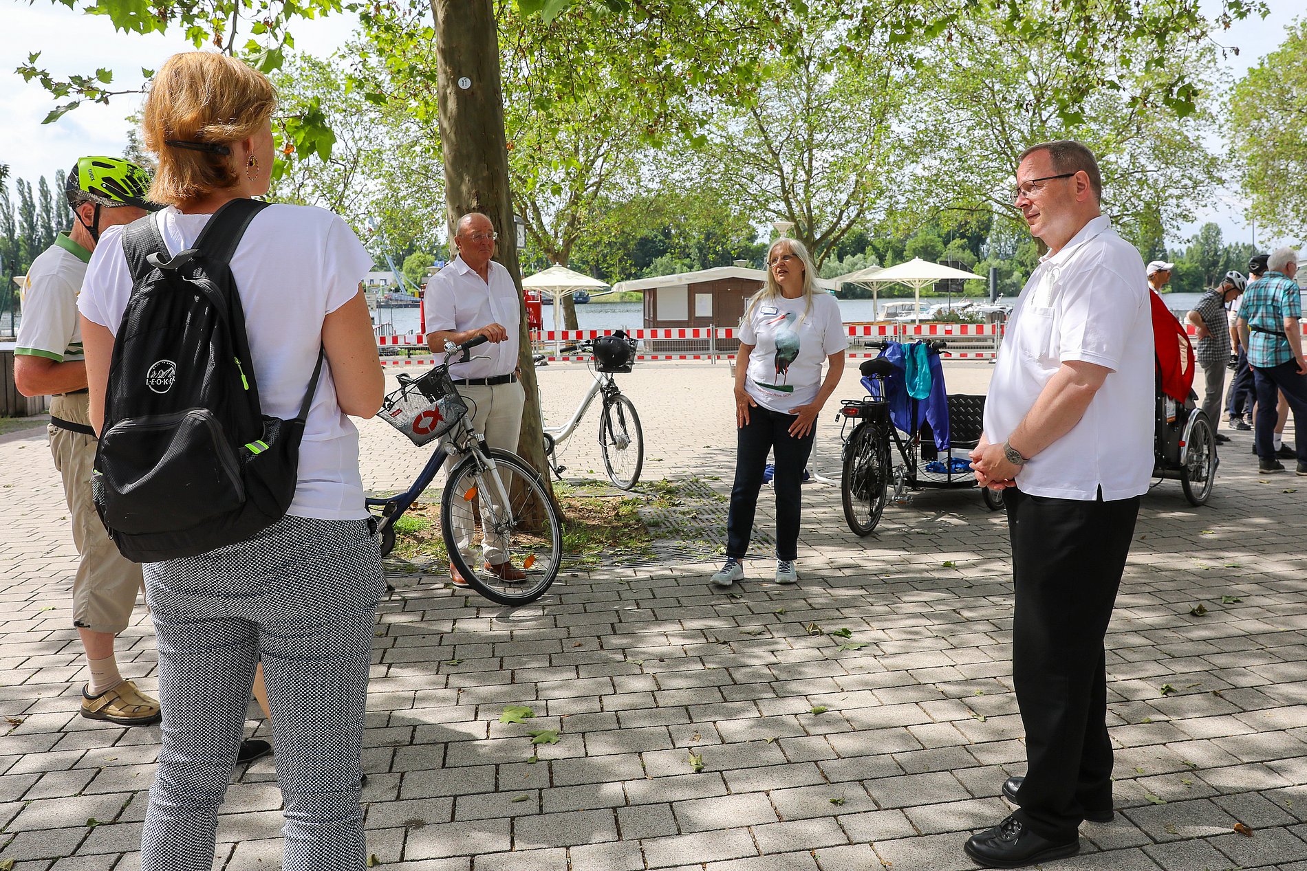 Wiesbanden - Der Himmel meinte es gut mit uns und so konnte die sozialräumliche Radtour am 12. Juni unter Beteiligung von Bischof Georg Bätzing und 38 Teilnehmerinnen und Teilnehmern wie geplant durchgeführt werden. Erst zwei Tage zuvor erreichte Wiesbaden die notwendige „Lockerungsstufe 2“ der Pandemie, die das soziale Leben der vergangenen 15 Monate so stark eingeschränkt hatte. Somit war es auch ein sozialer Neustart für die Wiesbadener Stadtgesellschaft.